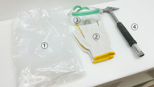 厚手のビニール袋の中で割れば、口を縛ってそのまま棄てることができます。厚手のビニール袋が無いときは2枚重ねでもOKです。